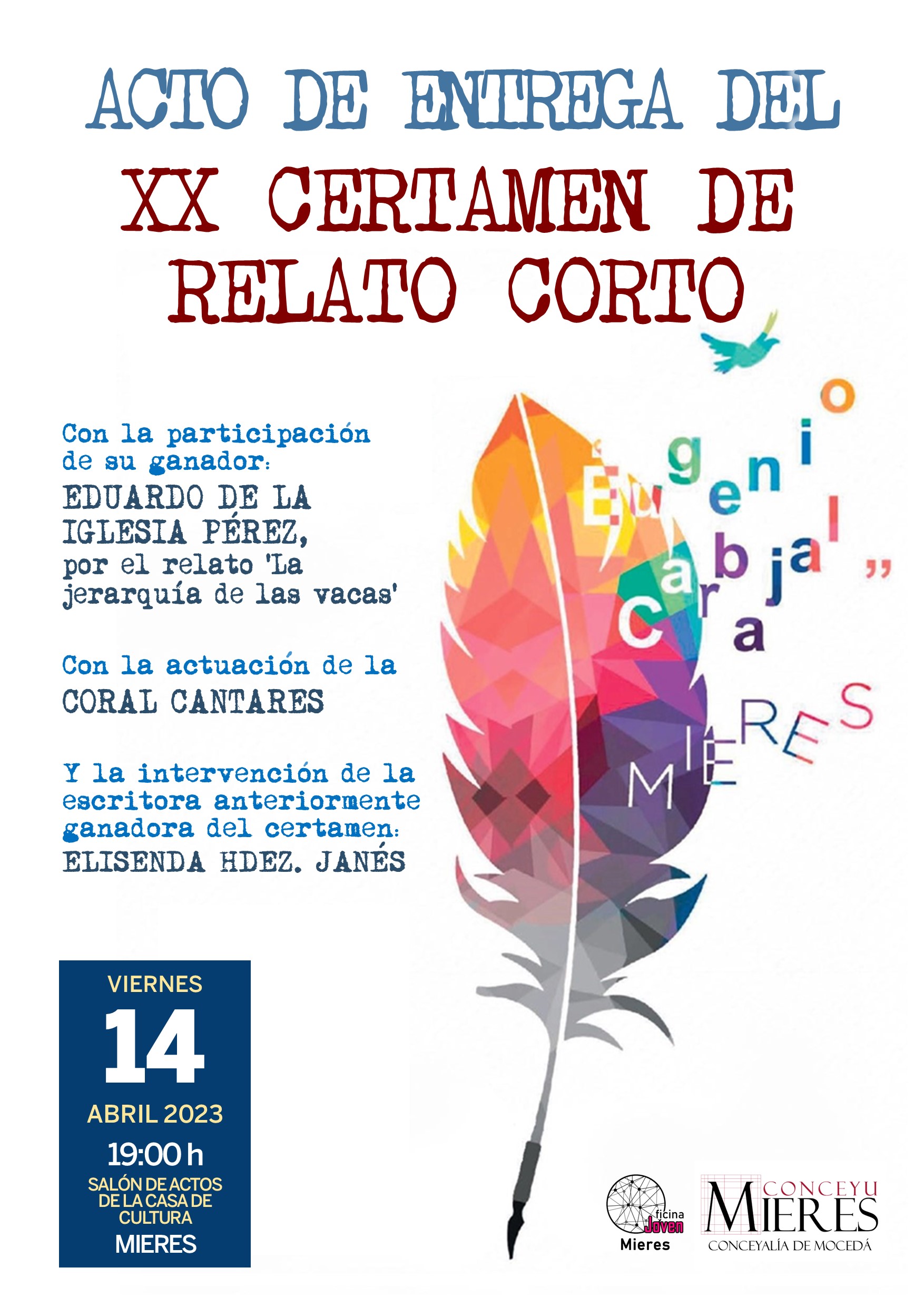 El relato que ha resultado ganador en esta 20ª edición ha sido La jerarquía de las vacas, cuyo autor es Eduardo de la Iglesia Pérez, un joven toledano de 25 años, graduado en Derecho y Ciencias Políticas. Este premio no es el primero para él ya que anteriormente había conseguido alzarse con la 20ª edición del Certamen Joven de Narración “El cuentacuentos”de Madrid y con la 29ª del Certamen Calamonte Joven Joven de Narración “El Cuentacuentos”, en Madrid, o el XXIX Certamen Calamonte Joven, en Badajoz.