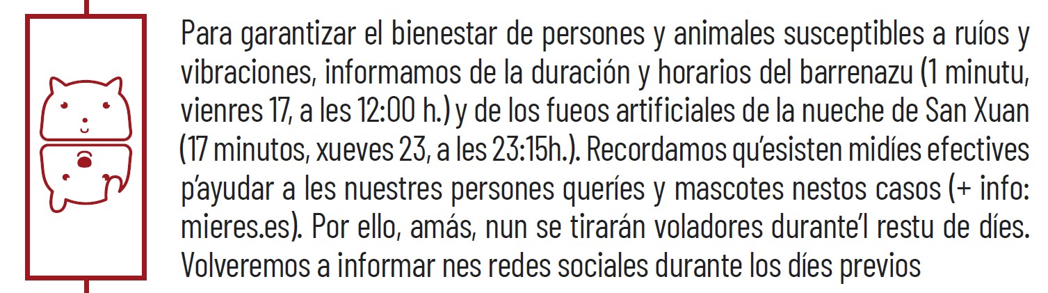 Para garantizar el bienestar de personas y animales susceptibles a ruidos y vibraciones, informamos de la duración y horarios en esta edición 2023 del barrenazu (1 minuto, vienres 16, a les 12:00 h.) y de los fuegos artificiales de la nueche de San Xuan (17 minutos, viernes 23, a les 23:15h.). Además, para garantizar dicho bienestar, durante las fiestas no se tirarán voladores.