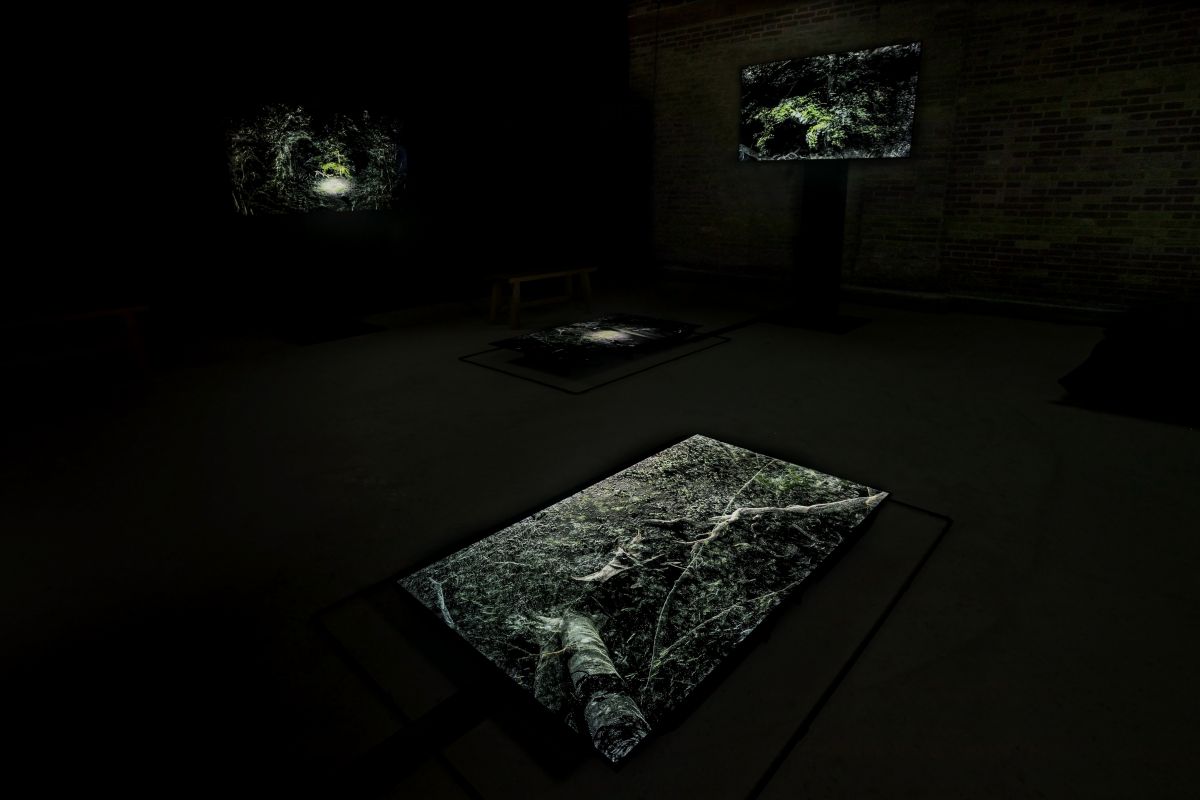 La instalación ocupa el espacio con múltiples pantallas que nos envuelven, sumergiéndonos en un paisaje digital creado a partir de imágenes reales. Es un entorno inmersivo, donde los paisajes en mutación revelan procesos de destrucción, crecimiento, erosión y cambio.
