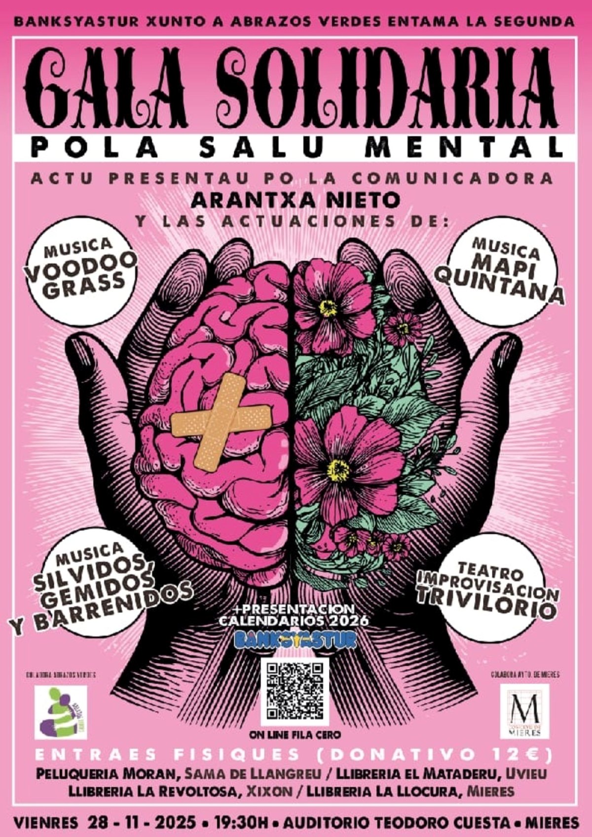 El auditorio Teodoro Cuesta de Mieres acogerá el próximo viernes 15 de noviembre, a partir de las 19.30 horas, una nueva edición de la ‘Gala solidaria pola salú mental’, organizada por el artista ‘Banksy Astur’ y la Asociación Abrazos Verdes, una organización de apoyo a familiares de víctimas de suicidio.