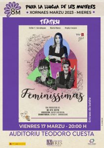 JORNADAS 8M 2023 Teatro: "Feminíssimas” por Cía. De Ste Xeito Viernes, 17 de marzo. 20:00h. Auditoriu Teodoro Cuesta Entrada libre hasta completar aforo Creación colectiva con la amistad como fondo y el feminismo como forma. Un Congreso Feminista en la ciudad de Vigo. Tres amigas de la adolescencia que hace años que non […]