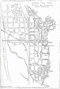 El plano recoge la disposición del núcleo, con la calle trazada por el mismo arquitecto para enlazar, aquí, las carreteras general y de la estación.